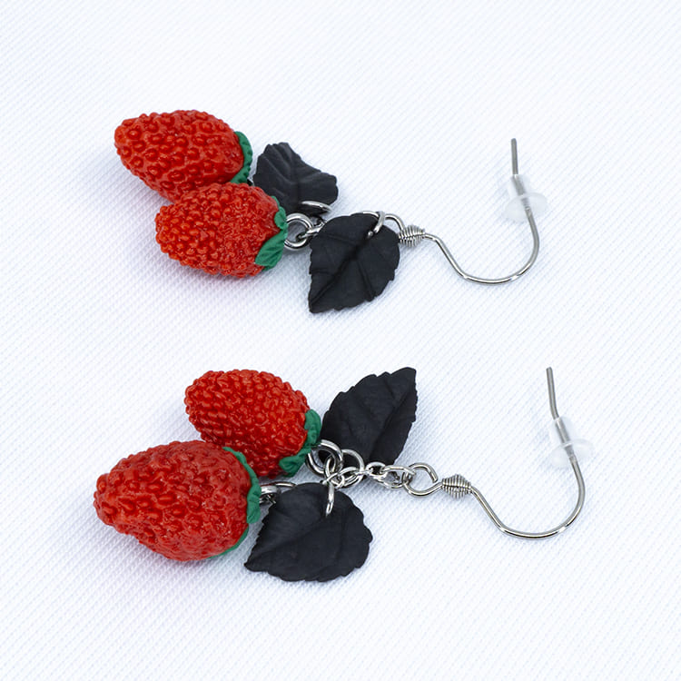 Выбирая наши серьги ягоды земляники с чёрными листочками для себя или в подарок, вы несомненно будете в восторге от качественного изделия из медицинской стали и полимерной глины. Серьги смотрятся изысканно и подойдут как для торжественных случаев, так и для повседневной носки.